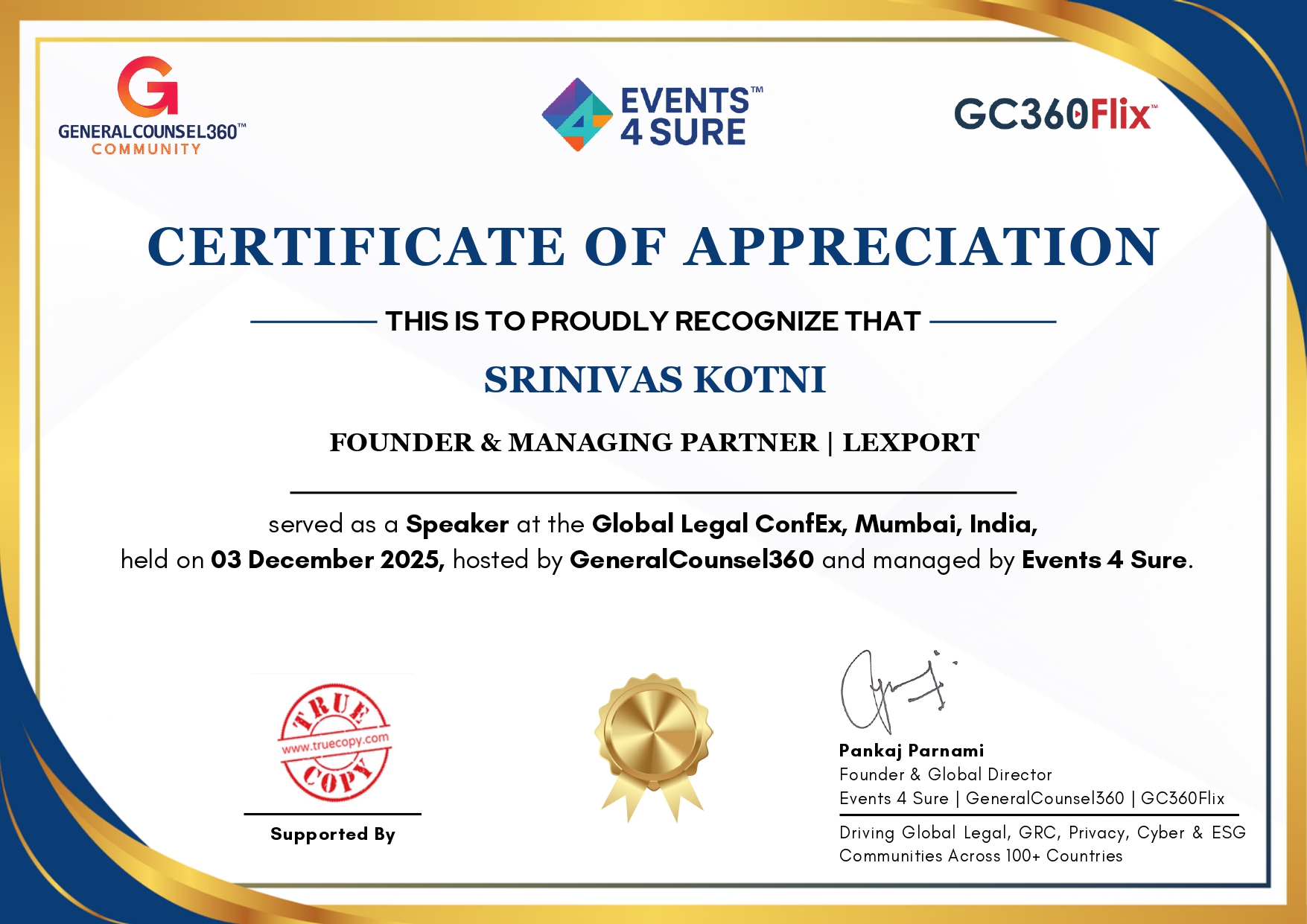 Srinivas Kotni Founder & Managing Partner Served as a Speaker at The Global Legal Confex, Mumbai, India, Held on 03 December 2025, Hosted by General counsel 360 and Managed By Events 4 Sure