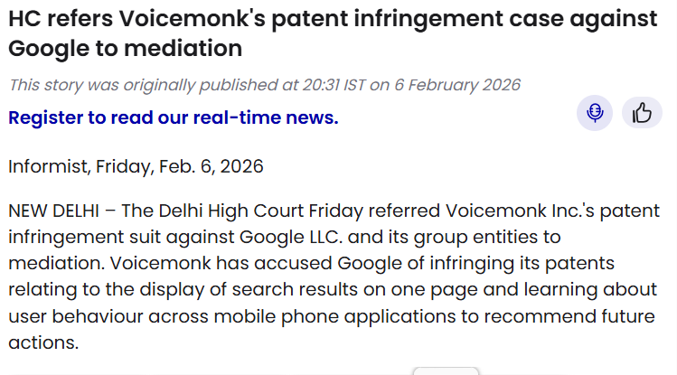 Delhi High Court Refers Voicemonk-Google Patent Dispute to Mediation, Voicemonk Inc. v. Google LLC & Ors. [Decision dated February 06, 2026]